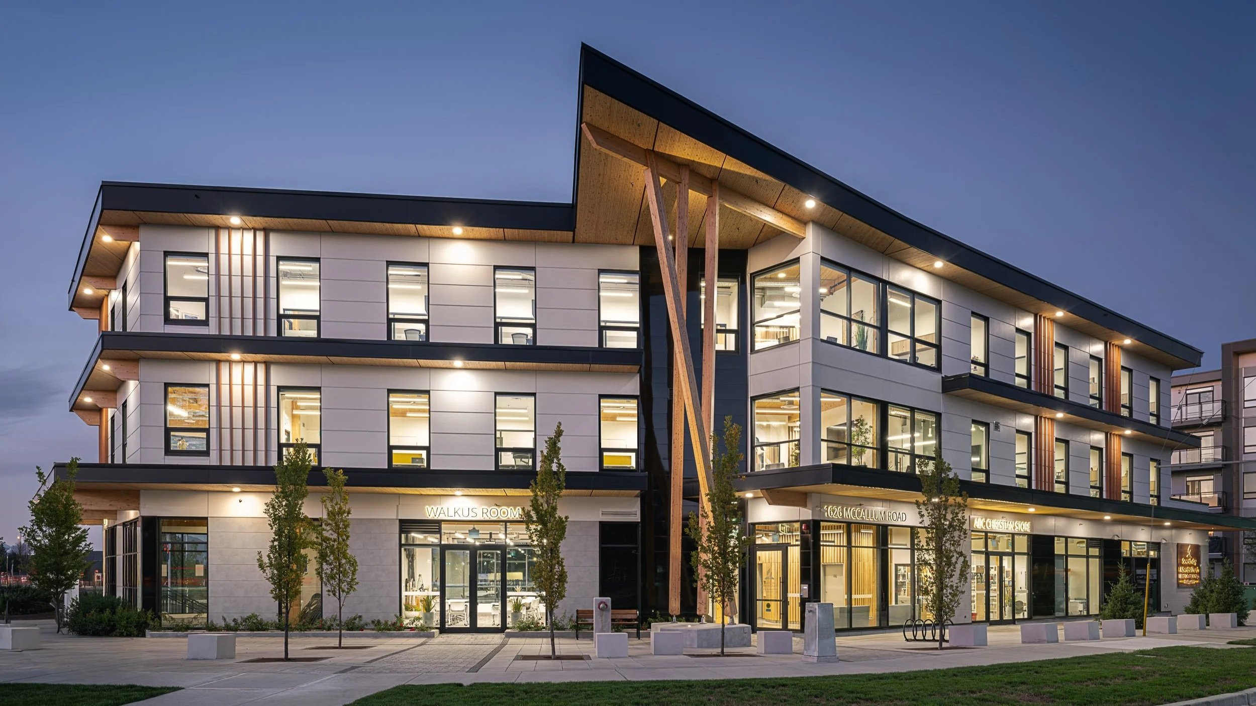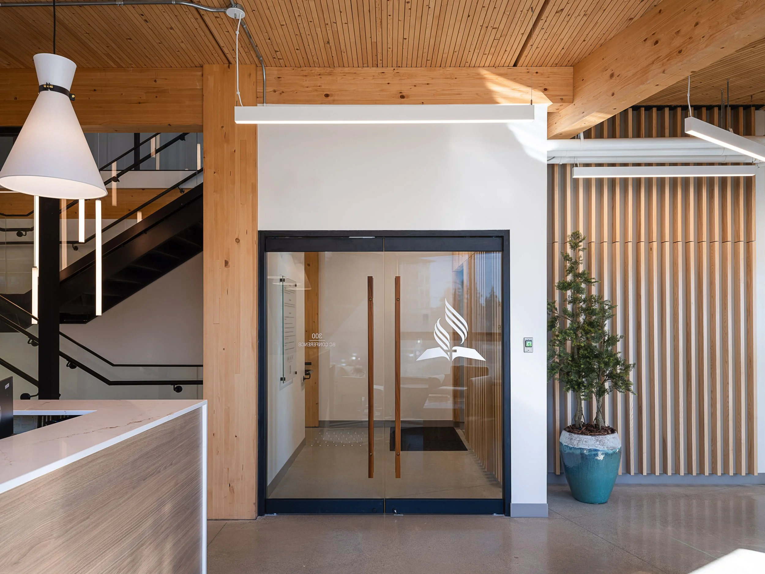 The headquarters for the Seventh Day Adventist B.C. & Yukon, a pure expression of Site Lines Architecture’s innovative and sustainable design ethos, is marked by its use of mass timber and distinctive twisted beams that welcome visitors. These beams not only serve as an architectural focal point but also signify the embrace of community and nature. The use of natural materials speaks to a commitment to environmental stewardship, while the building's transparent glass allows for a fluid interface with the surrounding landscape. The design's organic forms and warm wood construction create an atmosphere of tranquility and strength, reflective of the organization's values and its role as a regional anchor for faith and service.